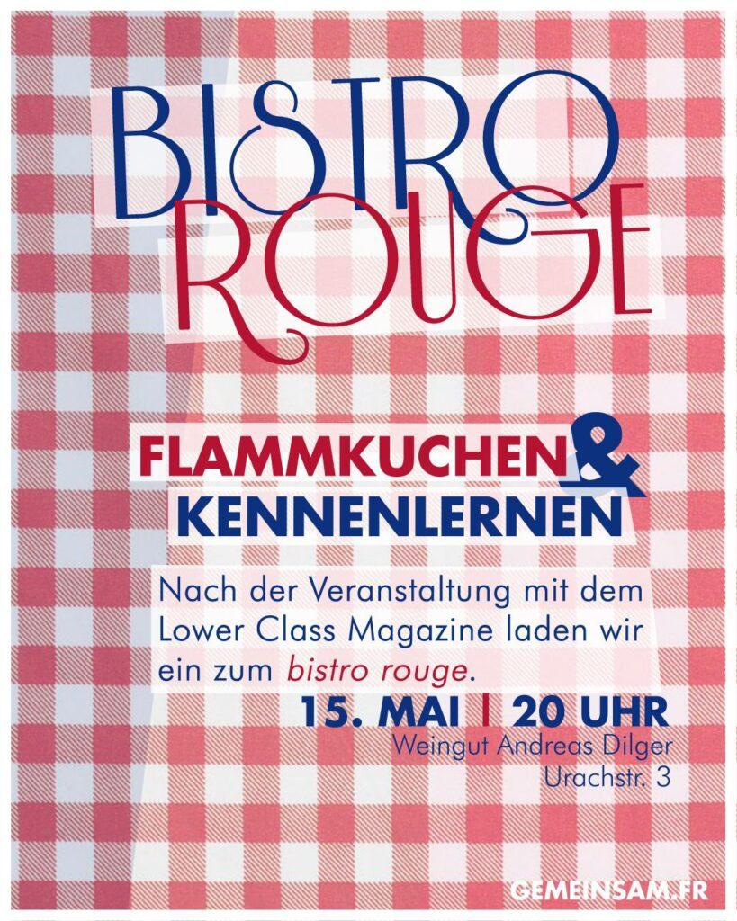 Nach der Veranstaltung mit dem Lower Class Magazine: „Aufrüstung, Wehrpflicht, Krieg… Was tun?“ wollen wir den Abend im bistro rouge bei hoffentlich bestem Wetter mit Flammkuchen aus dem Ofen ausklingen lassen. 15. Mai | 20 Uhr | Weingut Andreas Dilger