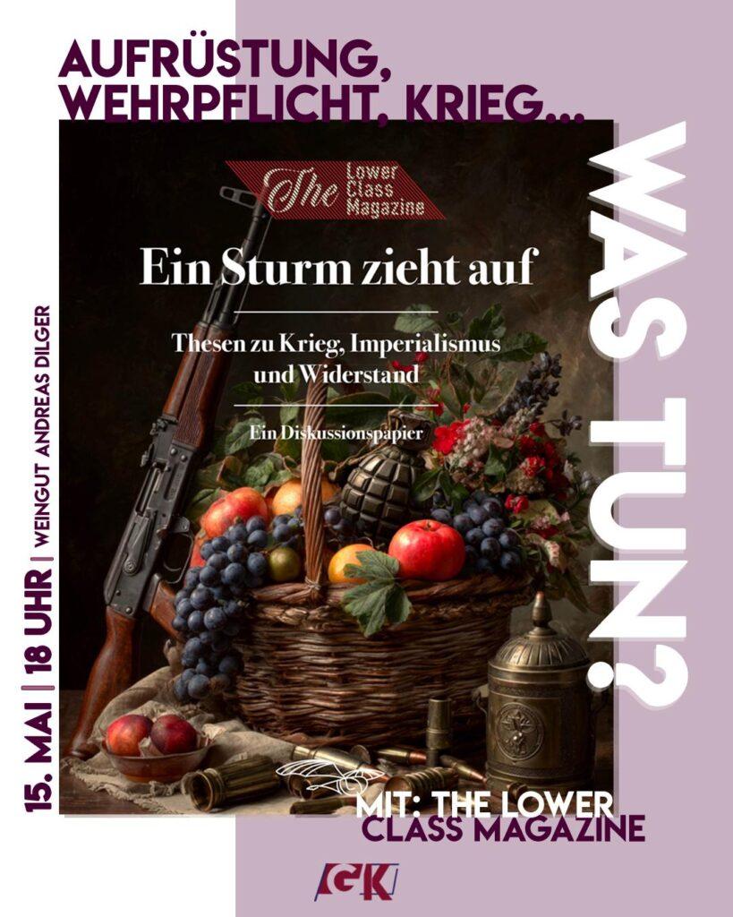 15. Mai | 18 UhrWeingut Andreas Dilger, Urachstraße 3 Massiver Sozialabbau, das heftigste Aufrüstungspaket seit dem Ende des Zweiten Weltkriegs und die wiedereingeführte Wehrpflicht: Ein Sturm zieht auf! Denn es stellen sich uns existentielle Fragen. Wir brauchen Analysen und Strategien für das auf uns zurollende Gewitter aus imperialistischen Kriegen und gesellschaftlichen Verteilungskämpfen.. Das Lower Class…